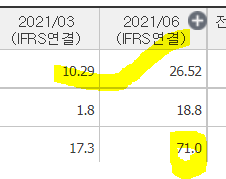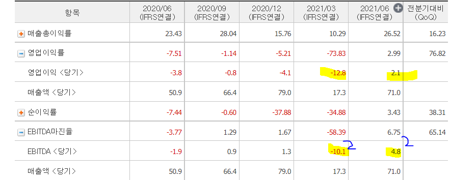 ㅡ분기별로 보면, 1Q21 대비 2Q21 매출총이익률 증가했으며, 1분기에는 매출이 거의 없어 매출총이익률이 낮은 것으로 보인다.
