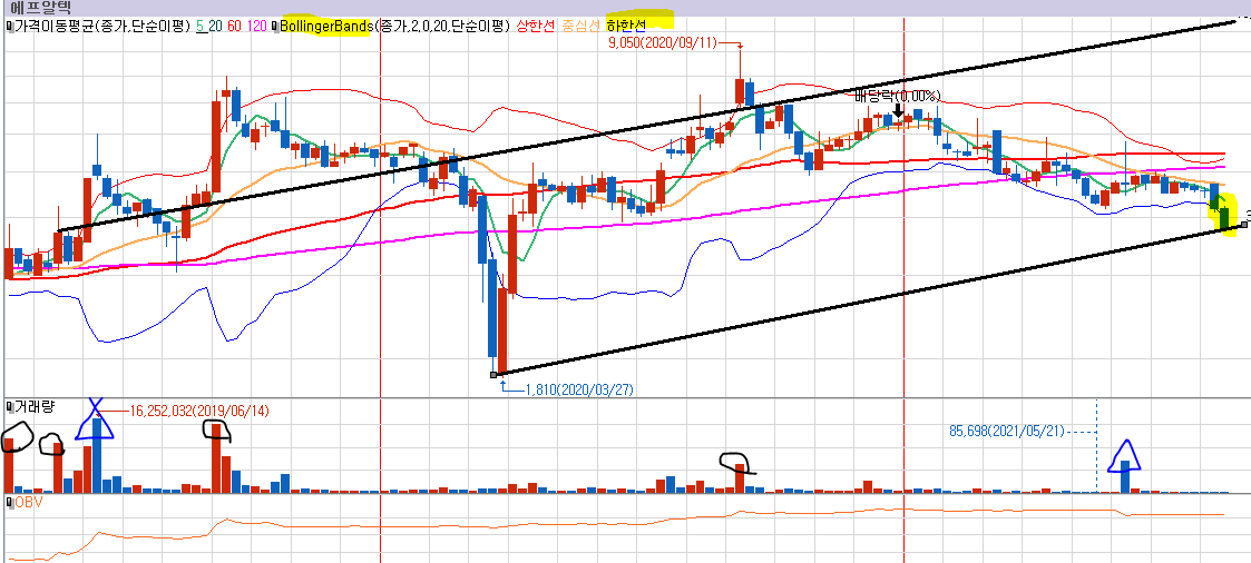 /OBV 살아 있으며, 양봉거래량 대비 음봉거래량으로 봤을 때 매집 이후 모두 빠져나간 상황은 아닌것으로 보인다*.
