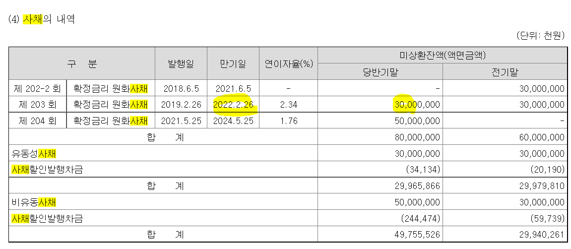 ㅡ현대비앤지의 경우 22.2.26일 300억의 사채 만기일이며, 반기 말 기준