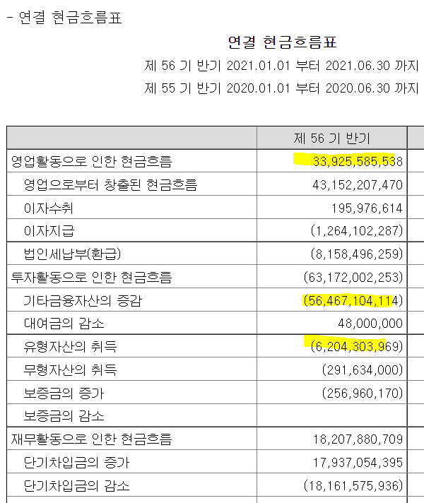 /2Q21 + - +/ 영업번돈 + 빌린돈 -> 투자?? 하는 패턴??@ 으로 대충 보이는데,