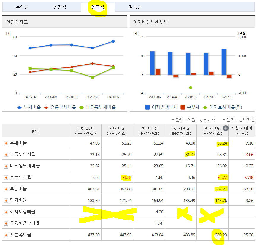 ㅡ자본유보율 500%로 평균 이상이며, 현금의 유동성이 커서 위기에 잘 대처할 수 있음을 알 수 있다.