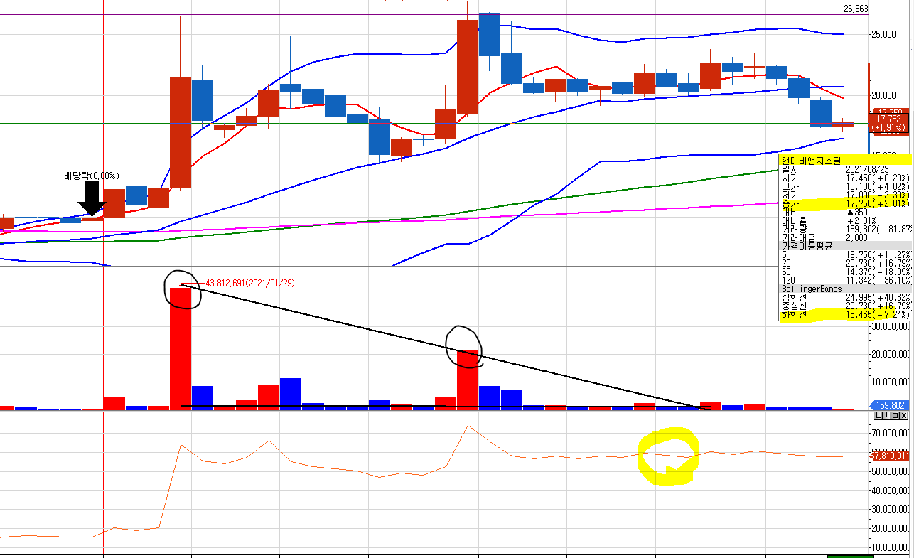 /현재 주가는 주봉기준 볼린저밴드 하한선 16,465원 ~ 중심선 20,730 사이에 위치하고 있다.