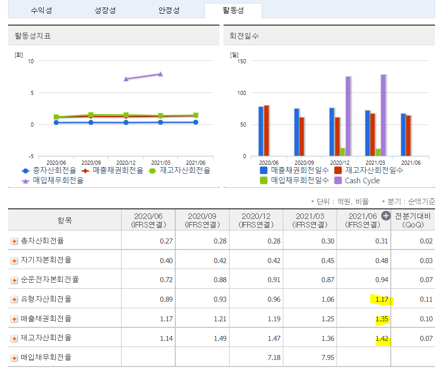 ㅡ매출채권 및 재고자산 회전율은 철강업종 평균정도 모습을 보이며, 매출채권 회전율은 상승추세를 보인다(클 수록 매출채권 회전일수가 짧아짐).