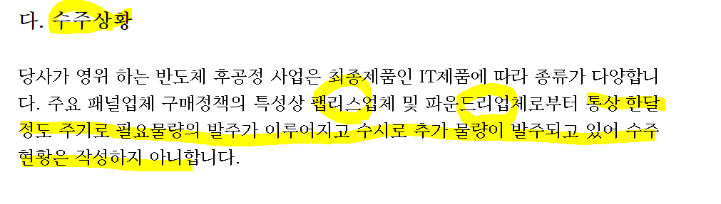 /후공정 업체 특성상 한달 주기로 물량 발주 이루어져, 수주현황은 의미가 없는듯.