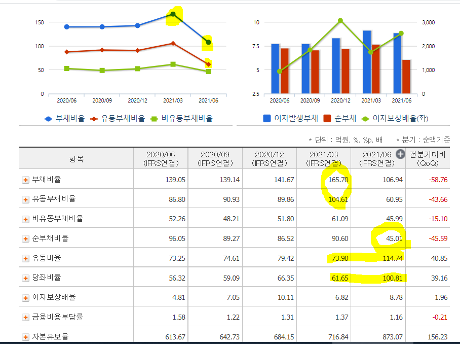 /순부채비율 높은 편으로 2Q21 유동비율 및 당좌비율 확대로 현금화가능 유동자산 증가하여 낮아졌지만, 아직도 이자발생부채가 많은 편이다.