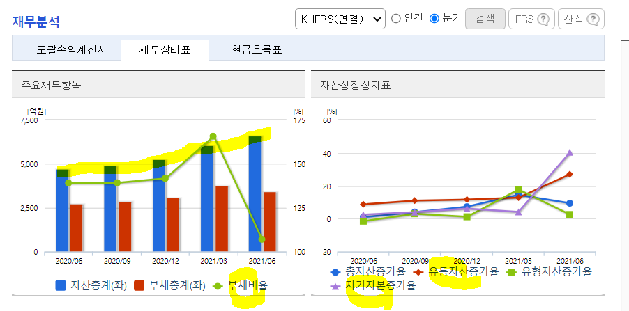 ㅡ자산총계 확대와 동시에 부채비율 감소추세 보이며, 2Q21 큰 증가를 보이는 유동자산과, 자기자본 증가를 살펴보자*