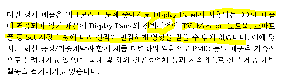 /DDI매출은 전방산업(TV, 모니터, 노트북, 스마트폰)에 시장 업황에 실적이 달려있기 때문에 지속적인 모니터링 필요함.