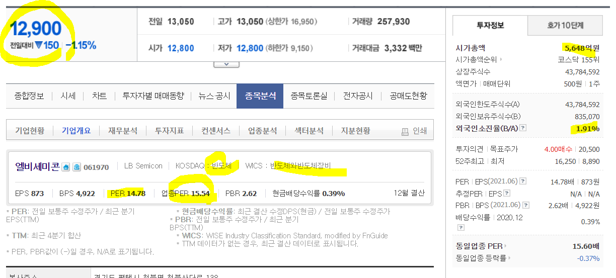 ㅡ시가총액 5천억대 기업으로, 반도체와 반도체장비 업종이며 21.8.27.종가 기준 12,900원을 기록하였다.