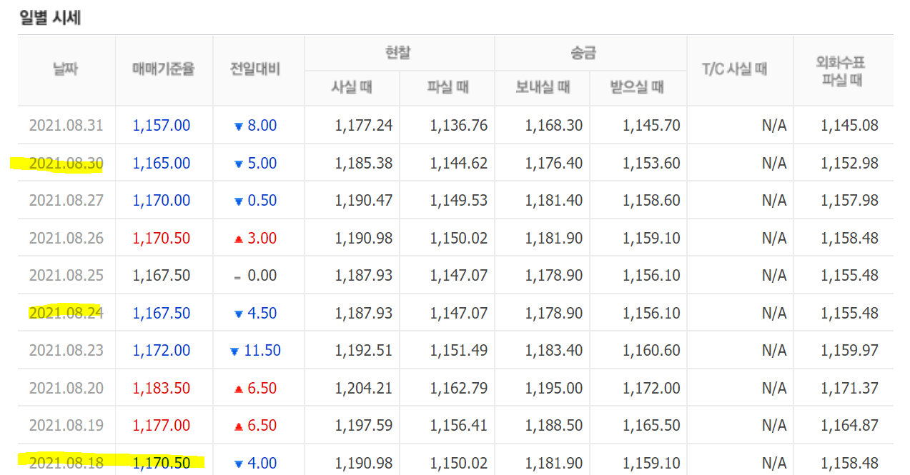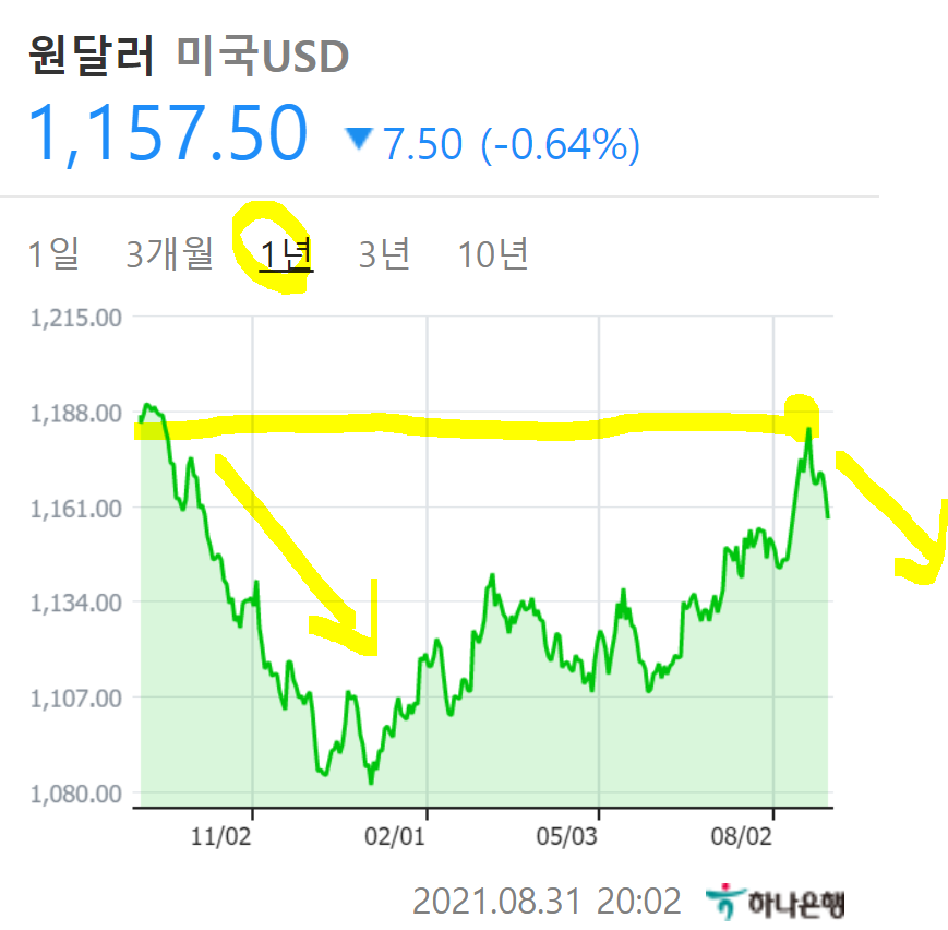 /원달러 환율을 보면, 21.8.20. 1,183.50의 고점을 찍고 하락추세로 접어든 것으로 보이는데, 우리의 기준점 3일간의 각각 환율을 보면@