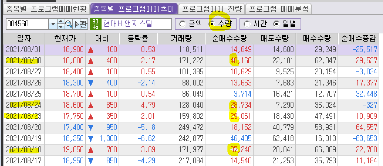 /8.20일 코스피 최저, 환율 최고, 현대비앤지 주가 최저점 , 공매도 수량 큰 증가지점, 프로그램은 순매수 발생했으며, 오히려 전일인 8.19일 프로그램 순매도가 있었다. 선물 대비 현물의 가치가 비싸서 미리 프로그램 매도가 발생하고 현물 주가의 최저점인 8.20일에는 선물 대비 현물이 싸서 프로그램 차익 매수가 발생한 걸까?? 이후 프로그램 순매수 이어지는 추세는 보인다.