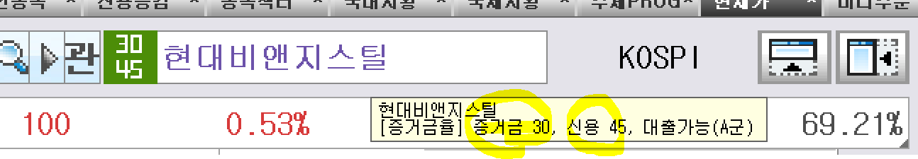 /보면 현대비앤지는 증거금 30에 신용45로 되어 있는데,