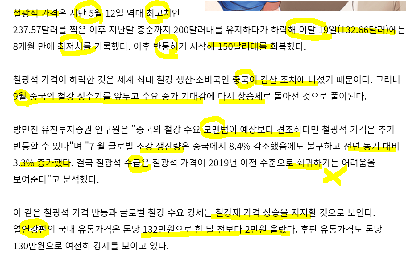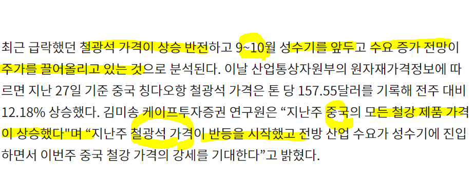 / 철광석 가격의 상승 반전 + 9~10월 철강산업 성수기를 앞둔 수요 증가 전망이 주가상승의 원동력이라고 한다. 철강 제품 가격도 함께 상승했다고 한다.