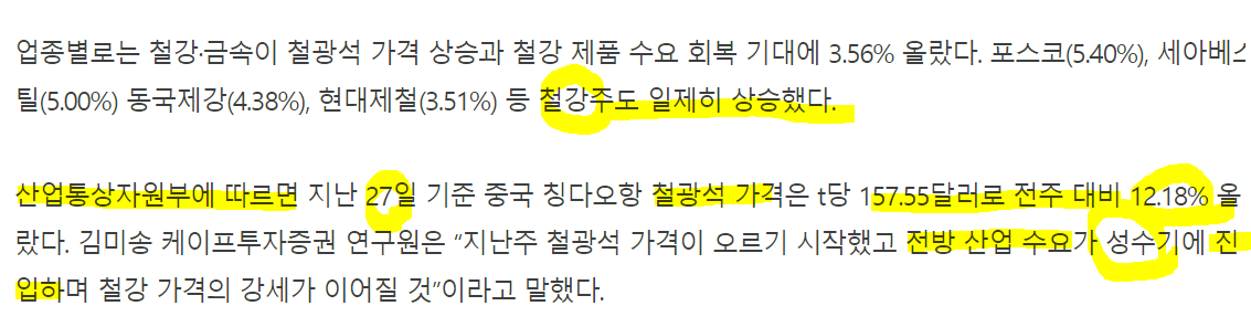 /철광석 가격 상승 + 전방 산업 수요증가(성수기 진입)