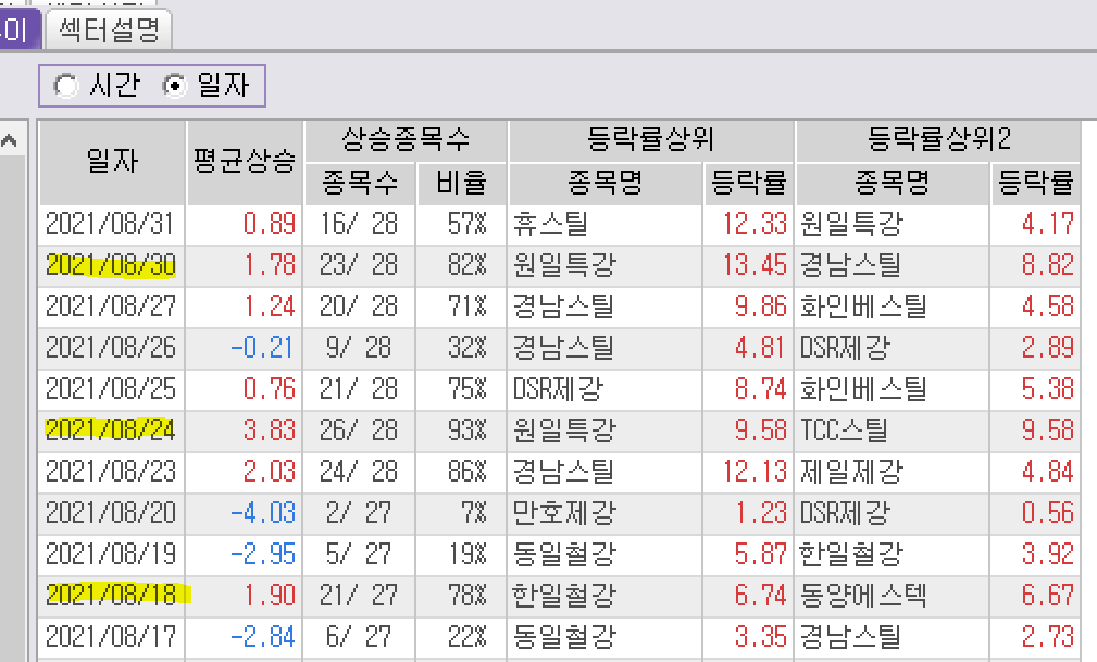 ㅡ철강 중소형 섹터의 일자별 변화 추이를 보면,