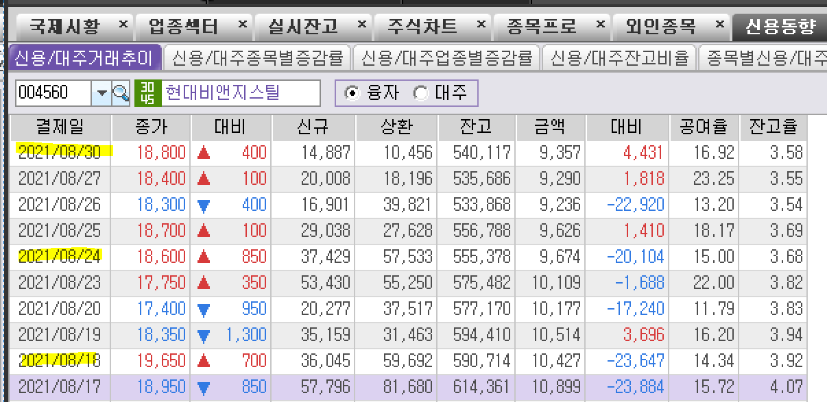 /8.20.대차잔고 577,170로 전일 대비 -17,240 줄었으며, 공여율 큰 감소와 함께 잔고율 감소를 보인다.