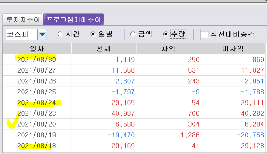 ㅡ일자별 코스피 매매추이로, 우리의 기준일 3개를 보면,@