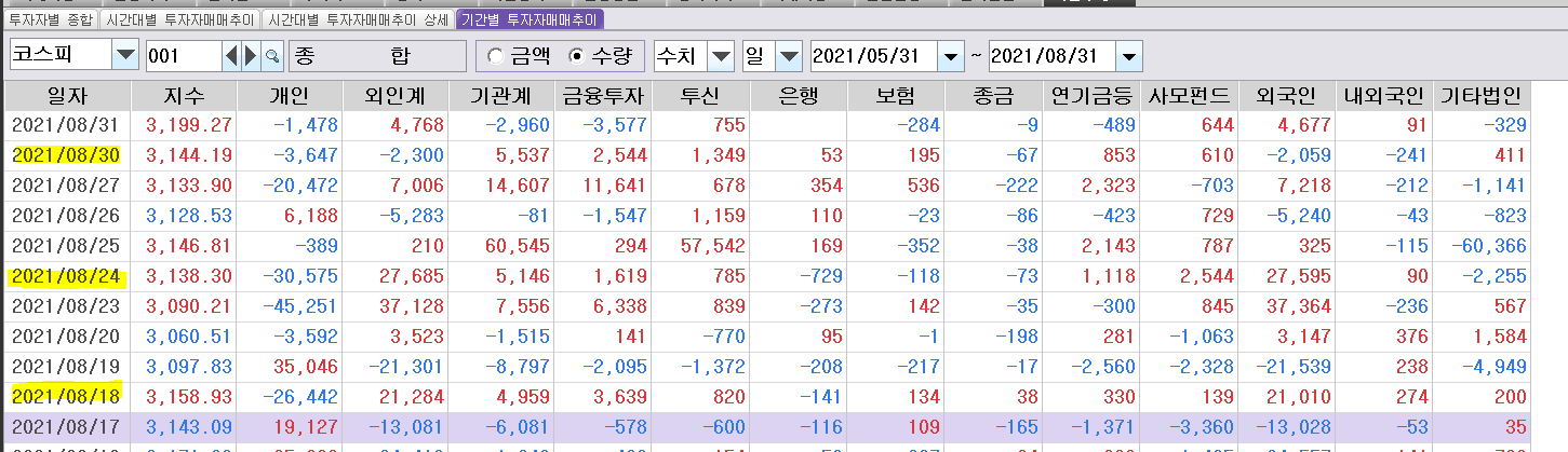/8.24./ 3,138.30. 전일 대비 48.09 올랐으며, 외국인과 기관계 모두 산 것으로 보인다.