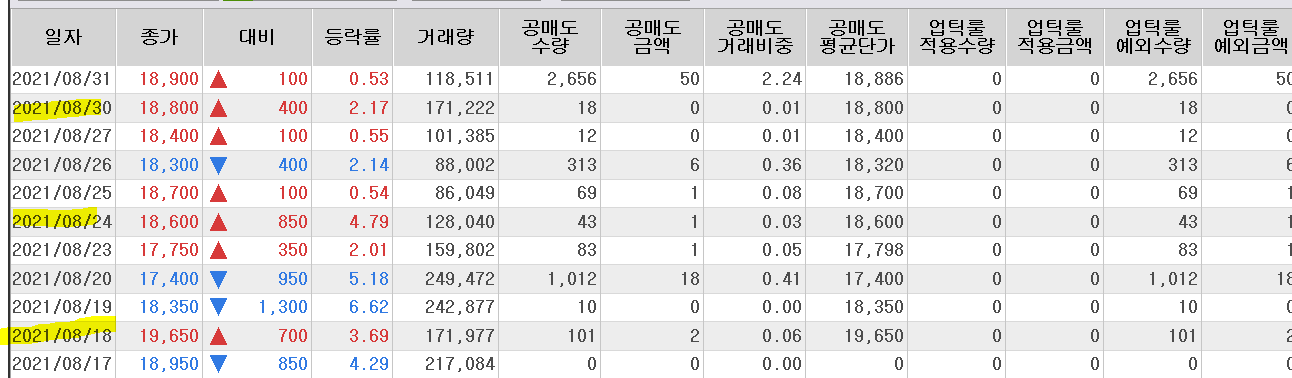/복잡하게 하면 또 머리아프니까, 딱 21.8.17~31.기간동안 주가 등락율이 가장 컸던 3일을 뽑아 기준점을 잡고 분석을 해보자.
